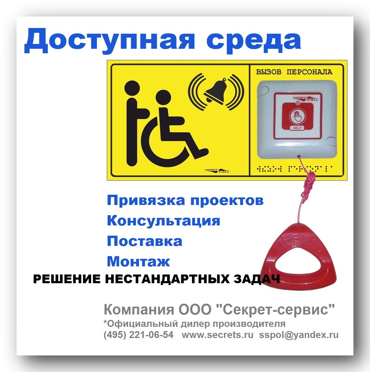 Отдельное направление компании - поставка и монтаж систем палатной сигнализации и систем вызова помощника для МГН (маломобильных групп населения) по программе ДОСТУПНАЯ СРЕДА